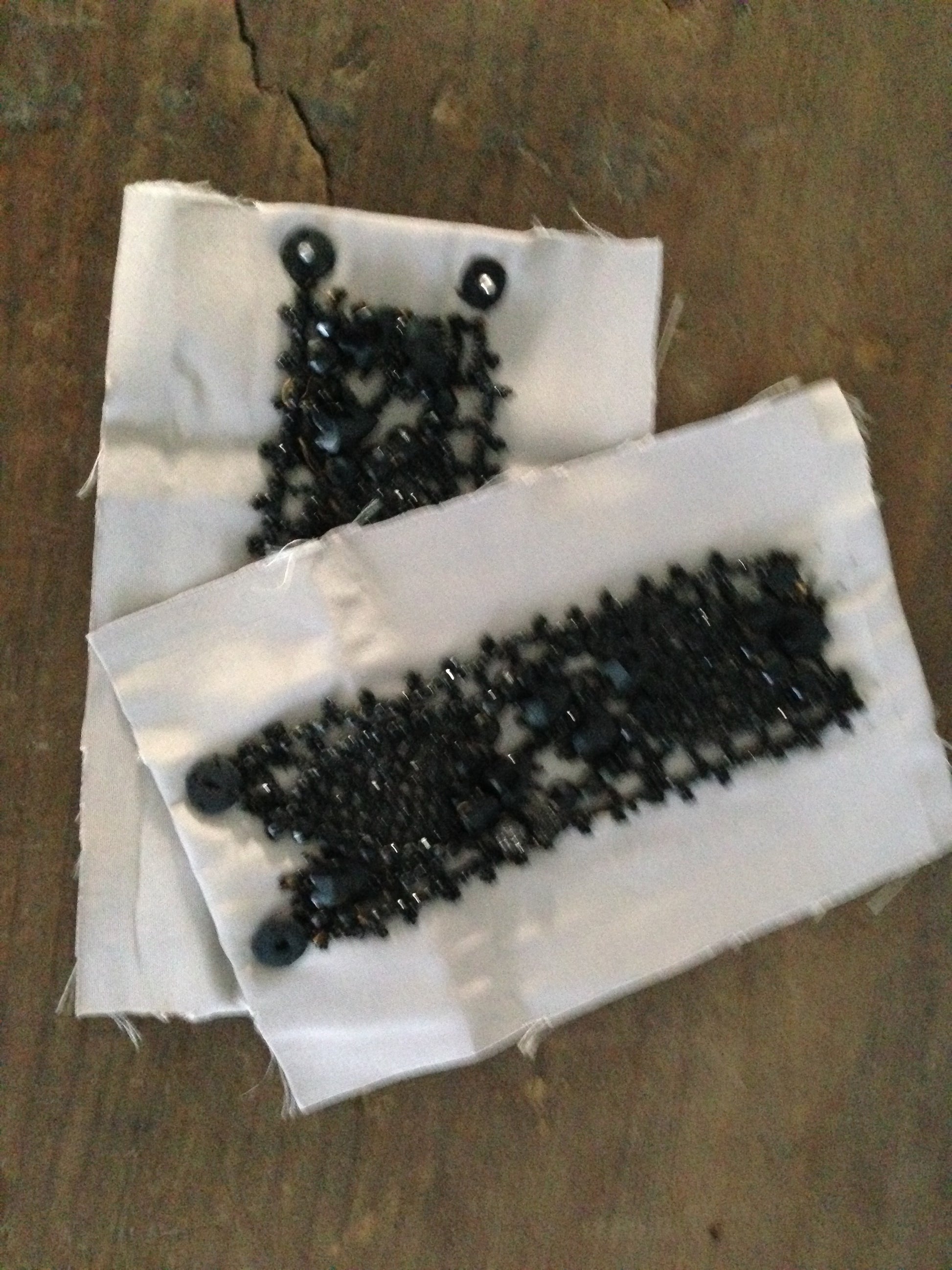 Grey/Gold Faille with fringed edges and black beaded cuffs : Pair Width/L: 5 1/4"