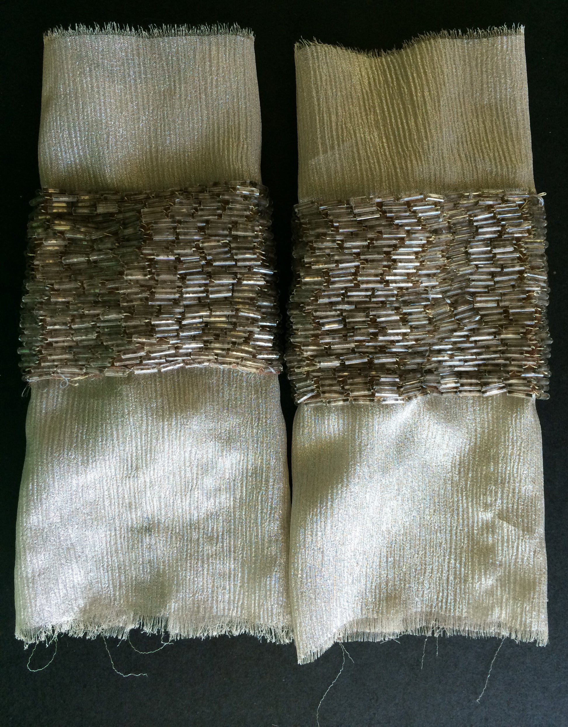 Grey plisse silk with Silver bugle beads: Pair Width/L: 7"